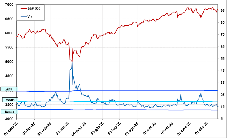 Cet indicateur présente la relation de contrariété classique avec l’indice S&P500 et, surtout, forme des pics très prononcés correspondant aux creux du marché, comme on peut facilement le voir sur le graphique ; c’est pourquoi on l’appelle également « l’indice de la peur ».