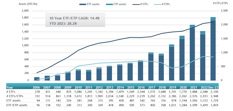 - Assets invested in the ETFs industry in Europe reached a new milestone of $1.82 Tn at the end of 2023 beating the previous record of $1.72 Tn at the end of November 2023.