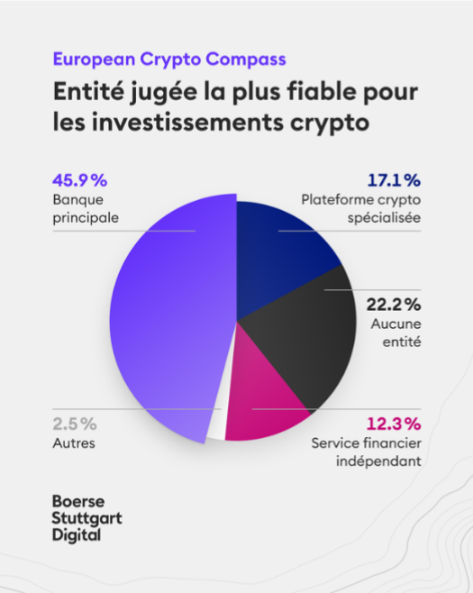 Par ailleurs, 45,9 % des Français interrogés ont cité leur banque principale comme principal acteur de confiance pour la gestion de leurs investissements dans les cryptomonnaies, soit le taux le plus élevé parmi les quatre pays étudiés (contre 40 % en moyenne européenne, 39,7 % en Espagne, 37,7 % en Allemagne et 36,8 % en Italie). Seuls 17,1 % des Français interrogés se tourneraient vers une plateforme spécialisée dans les cryptomonnaies.