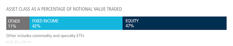 En pourcentage de la valeur notionnelle totale, les actions représentaient 47% et les titres à revenu fixe 42%, le reste étant constitué de FNB de marchandises et de spécialité. La proportion des transactions sur les ETF américains exécutées sur la plateforme via l’outil Tradeweb AiEX a dépassé 56 %.
