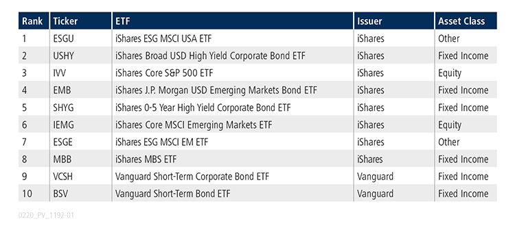 En janvier, 737 tickers uniques ont été échangés sur la plateforme ETF américaine de Tradeweb. Deux produits offrant une exposition à des entreprises mieux notées dans le domaine environnemental, social et de la gouvernance (ESG) figuraient parmi les dix ETF les plus fortement négociés du mois.