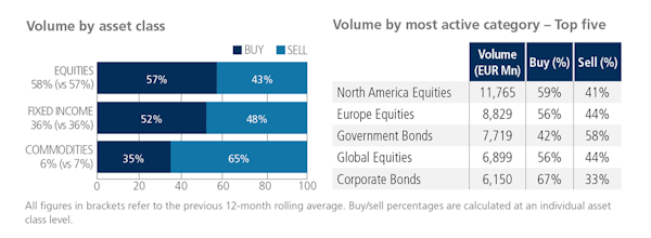In December, commodities was once again the only ETF asset class where ‘sells’ exceeded ‘buys’, this time by 30 percentage points. In contrast, equities and fixed income products saw net buying. Trading activity in equity-based ETFs remained at 58% of the total traded volume. North American Equities was the most heavily-traded ETF category, with EUR 11.8 billion in total notional volume.