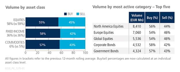 All ETF asset classes saw net buying for the second consecutive month. Trading activity in equity-based products increased to 58% of the overall traded volume, with ‘buys’ surpassing ‘sells’ by ten percentage points. North America Equities was once again the most heavily-traded ETF category with over EUR 8.4 billion in notional volume. Nearly all European-listed ETF categories were bought during the month, with the exception of Aggregates, Energy and Money Markets.