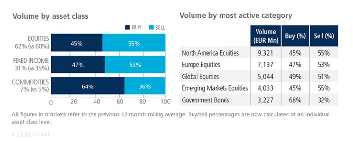 Both equities and fixed income ETFs saw net selling in February. In contrast, commodity-based ETFs were strongly bought, with ‘buys’ surpassing ‘sells’ by 28 percentage points. Overall activity in the asset class increased to 7% of the overall platform flow, beating the previous 12-month rolling average by two percentage points. More than EUR 21.5 billion was executed in the top three ETF categories by total notional volume.